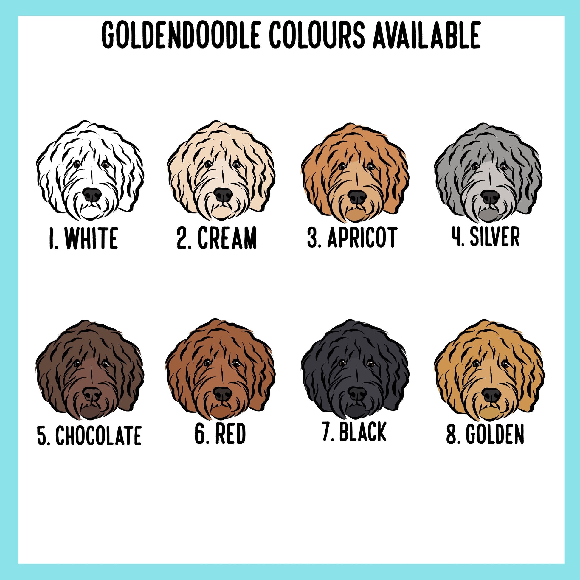 There are 8 Goldendoodle Breed colours to choose from - if your dog's colour is not on that list please contact us and we can customise it