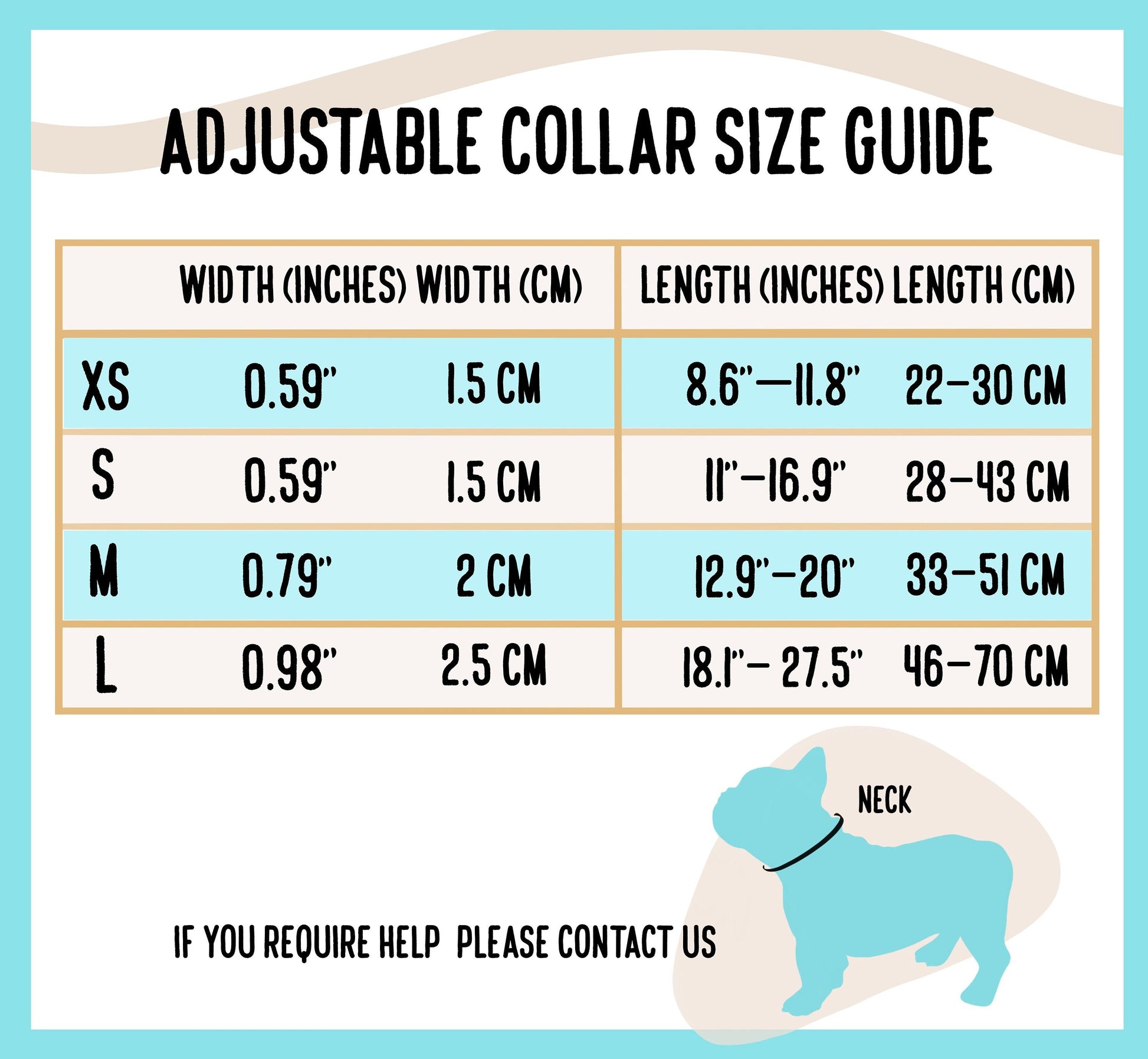 Collar sizing: XS- 1.5cm (width) x 22-30cm (length) S- 1.5cm (width) x 28-43cm (length) M- 2cm (width) x 33-51cm (length) L- 2.5cm (width) x 46-70cm (length)