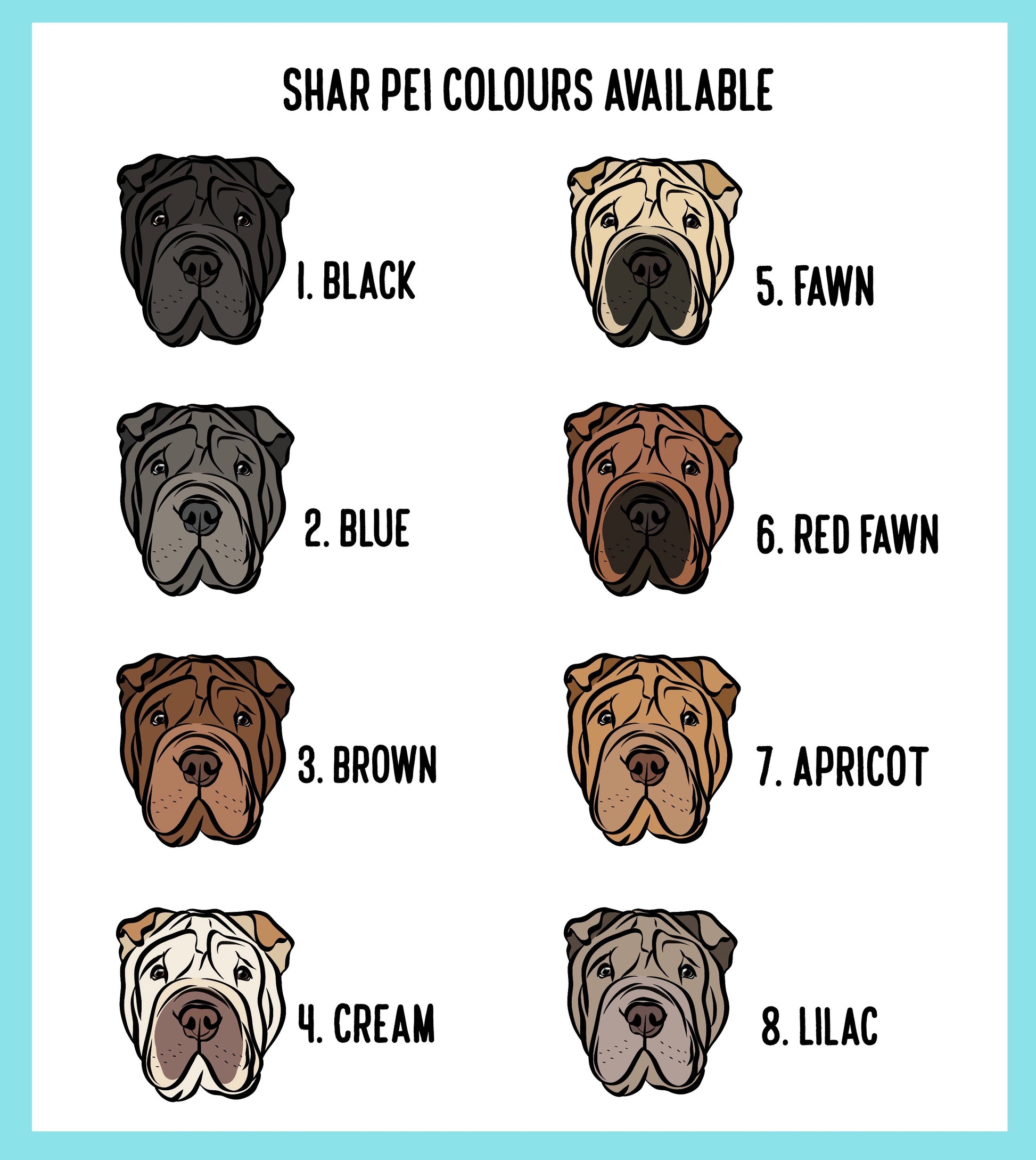 There are 8 Shar Pei Breed colours to choose from - if your dog's colour is not on that list or has specific markings please contact us and we can customise it